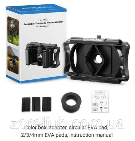 Універсальний телефонний адаптер APEXEL APL-F002X для телескопа, бінокля, монокуляра, мікроскопа, оптичного прицілу — тримач мобільного телефона, затискач для будь-якого смартфона, на діаметр окуляра 23-50 мм і смартфони завширшки 66-95 мм